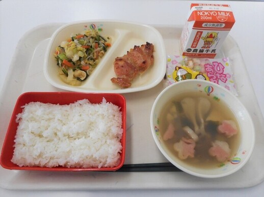 ごはん、牛乳、とり肉のまごころみそ焼き、えのきと小松菜の煮びたし、あさりのすまし汁、ひなあられ