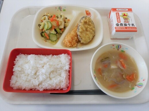 ごはん、天つゆ、天ぷら(えび・さつまいも)、牛乳、野菜のかわりづけ、みそけんちん汁
