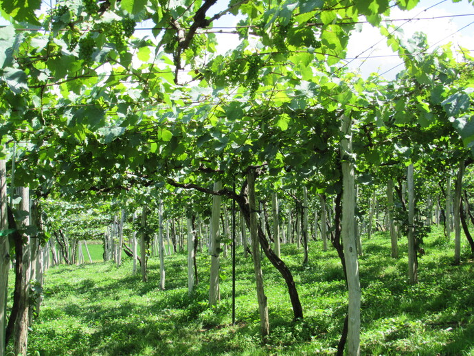 カビや病気を防ぐために、葉を取り除いて風通しをよくし、新しい枝やツルの支柱やブドウ棚へ誘引作業も行われます。