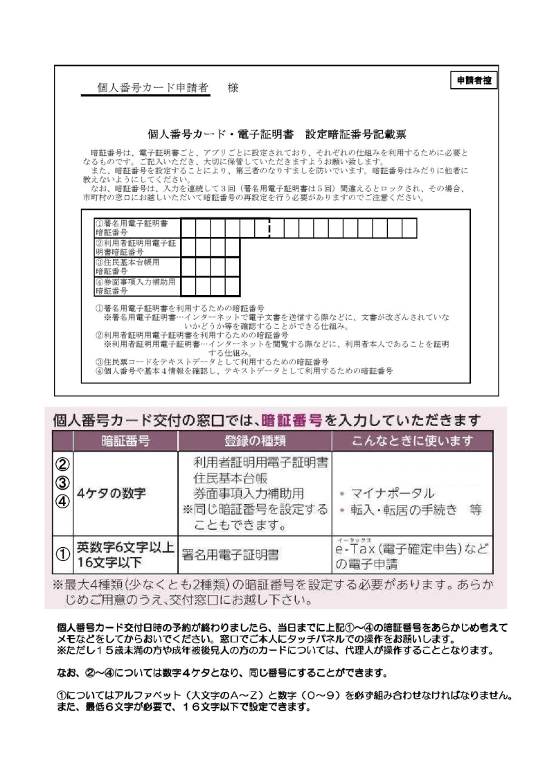 - 交付窓口で本人確認の上、暗証番号を設定していただくと、マイナンバーカード(個人番号カード)が受け取れます。