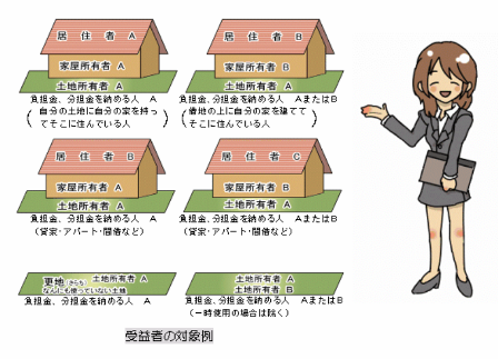 負担金を納めていただく方(受益者)は、下水道が整備された区域内の土地所有者(地主)、または、汚水を流す建築物の所有者の方です。