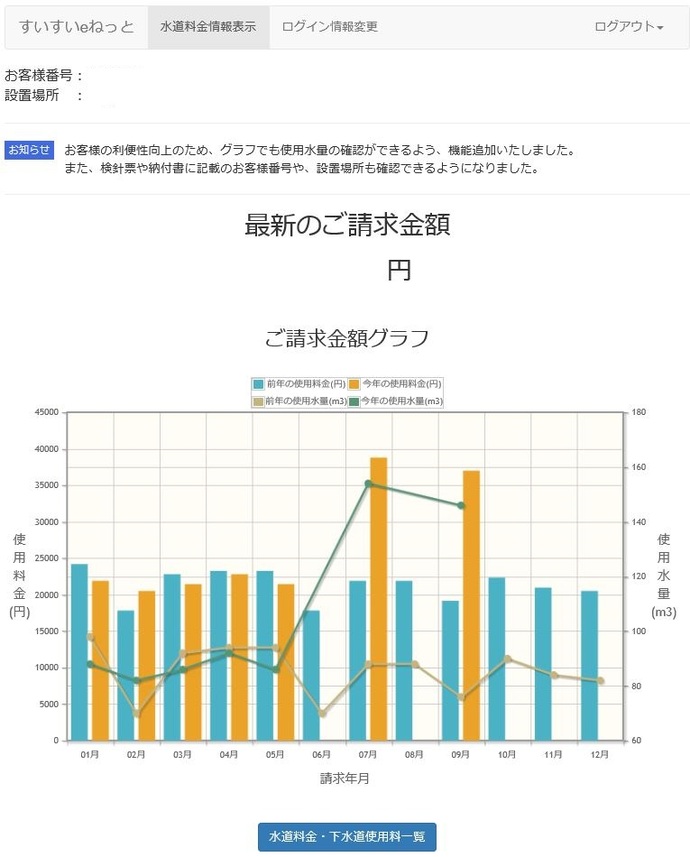 グラフや一覧表でいつでも確認できるため、前年との比較や、漏水が疑われる場合の判断にお役立ていただけますので、ぜひご活用ください。